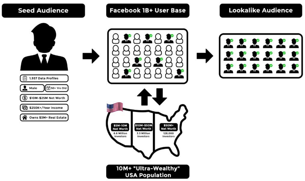 Pre-Built Advanced “Value-Based Lookalike Audience” Leveraging Our Proprietary “Seed” Audiences Of “Ultra-Wealthy” Investors Data Profiles Directly Uploaded Into Ad Platforms To Generate A Custom “Ultra-Wealthy” Lookalike InvestorAudience™ Targeting The 10M+ Ultra-Wealthy Population Segment Across The USA On Their Platform That Directly Match The Patterns Of Characteristics, Attributes, & On-Platform Behavioral Data Of Your Uploaded “Seed” Audience With Highest Statistical Relevance Score